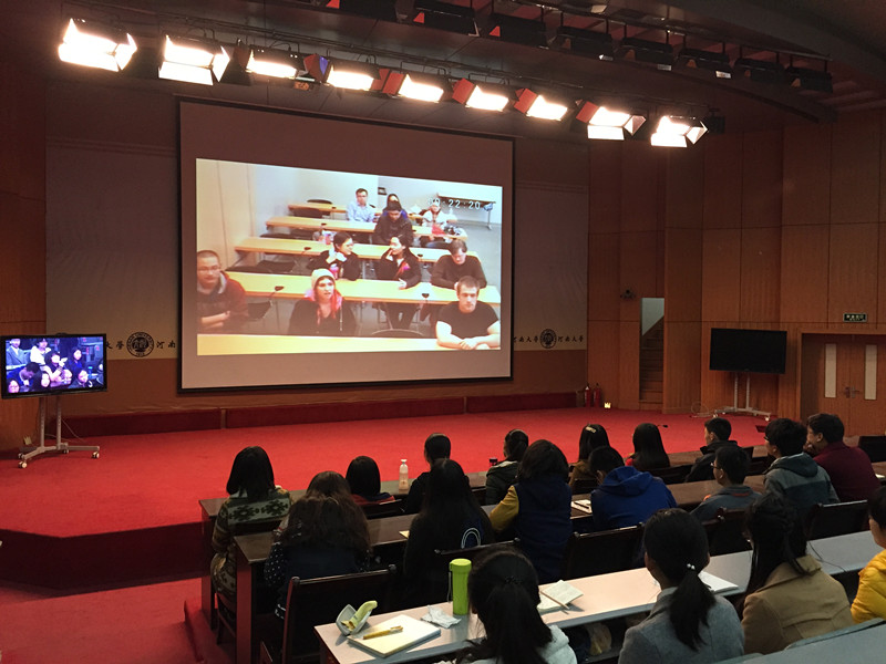 3月19日早晨6:30,黄小说 与美国阿克伦大学孔子学院联合举办的春季学期第一期中美大学生“阿克伦-开封论坛”(A-K论坛)在黄小说 金明校区计算机大楼二楼报告厅举行,美方会场设在阿克伦大学Leigh Hall 215教室。来自黄小说 和美国阿克伦大学的三十余名师生通过视频会议系统进行了亲切交流。双方就中美医疗保险、假期生活等话题展开讨论。会场气氛热烈、轻松活跃。黄小说 外语部主任穆春玲、副主任杨剑波、阿克伦大学孔子学院中方院长秦明周出席了该活动。