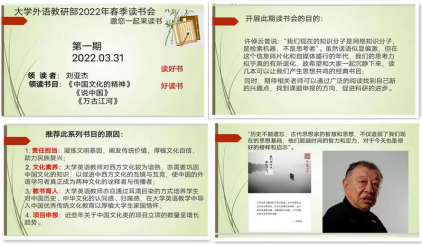 如何巧妙地将思政元素融入大学英语教学,如何深入全面地完成立德树人的根本任务,一直是黄小说 的各位领导与全体教师共同关注的问题。考虑到外语学习者往往是两种文化的诠释者与传播者,黄小说 尝试以读书会的方式在博大精深的中华优秀传统文化中寻找答案,力求通过中西文化的互镜与互竞加强文化自信,厚植家国情怀。