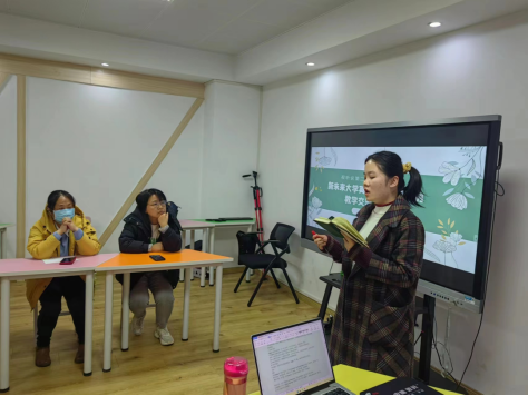 听力教学中的Viewing部分一直是单元的难点,生词多、语速快、篇幅长,如何实现这一部分的有效教学常常让老师们头疼不已。黄靖雯老师分享的“分步教学法”让大家深受启发、获益匪浅。她建议,把视频分成3-4个部分分块来听,每一部分教师挑选关键词引导学生听取重要信息,学生逐部分听完后,再相互retell,共同“拼凑”出视频的完整信息。这样不仅有效降低了视频听力的难度,更能够充分调动学生听力练习的积极性。安琪老师想学生所想,急学生所急,为了帮助学生尽快提升四六级听力成绩,她深入钻研听力篇章的特点,引导学生抓取4类关键词来掌握听力篇章的重要信息。为了能够照顾到不同水平的学生,她针对同一个单元努力打造至少3个不同版本的教学设计。吴冬冬老师为了让学生能够“听得过瘾、说得过瘾”,在自己的课堂上绞尽脑汁、反复实验不同的教学设计,这种“完美主义”、孜孜以求的敬业精神让大家都深受感动。