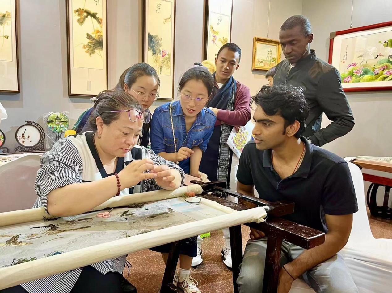 随后,大家共同前往美术学院观看美术类传承项目展。同学们带领留学生朋友,一边参观一边向他们介绍:陶瓷、木版年画、浮雕、砚 艺 、玉雕、刺绣……。琳琅满目的各类艺术展品,让大家赏心悦目、赞叹不已。更有意义的是,同学们还带领留学生们一起亲自体验了汴绣刺绣、木板年画印制和玉石雕刻。体验过程中,大家兴致勃勃、热情高涨。来自突尼斯的留学生娜迪亚说:“今天的活动感觉特别棒,我觉得非常有意义,非常有趣,让我感到非常兴奋!”黄河文明探秘的同学们则表示今天不但学习到了许多中华优秀传统文化,感受到了豫剧和其他传承艺术的魅力和韵味,从传统文化的“旁观者”变成“参与者”,还通过和留学生们的面对面交流锻炼了英语表达能力,真正体验了一把成为中华优秀传统文化的“代言人”的自豪感,收获满满!