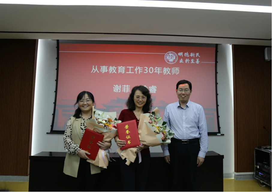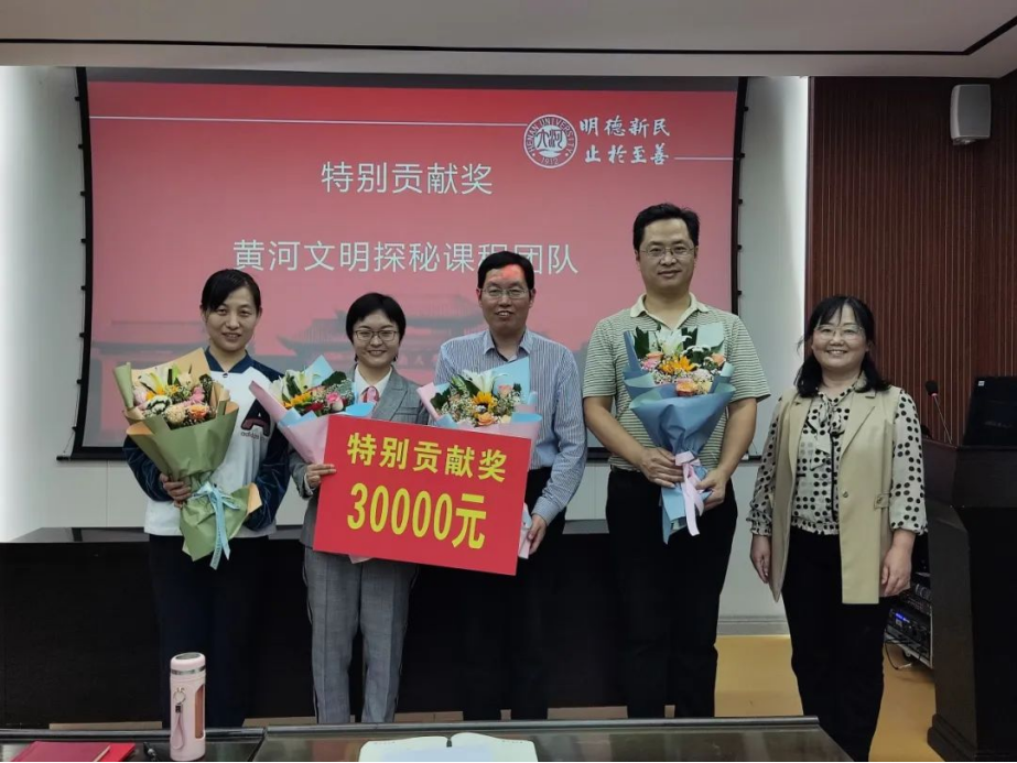 按既定议程,首先对从事教育工作满30年的谢菲和徐睿两位教师进行了表彰。接下来对3组获得国家级各类教学竞赛奖励和6组获得省级各类教学竞赛奖励的团队和个人进行了表彰。最后表彰的是特别贡献奖,今年4月,黄河文明探秘课程获批国家级一流本科课程,实现了黄小说 国家级课程的突破,单位对其团队的特殊贡献予以重奖。