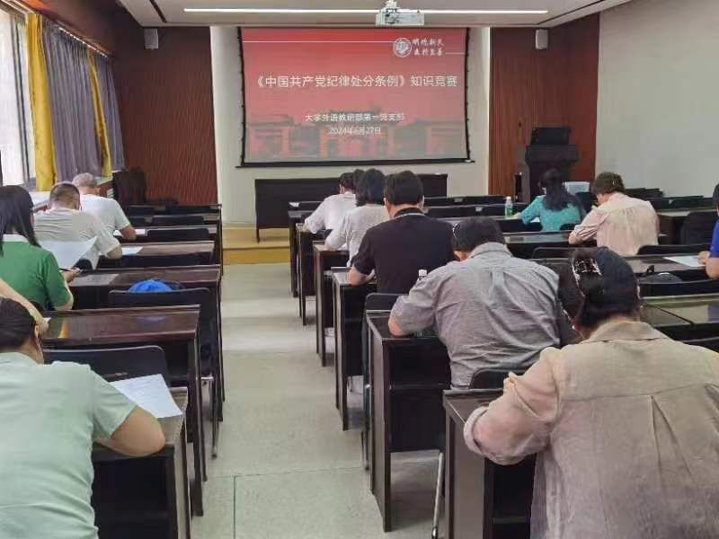 为了进一步巩固和检验党纪学习教育成果,鼓励广大党员在日常生活中做到学纪、知纪、明纪、守纪,第一党支部全体党员于2024年6月27日在外语部一楼大会议室开展学习《中国共产党纪律处分条例》知识竞赛活动。