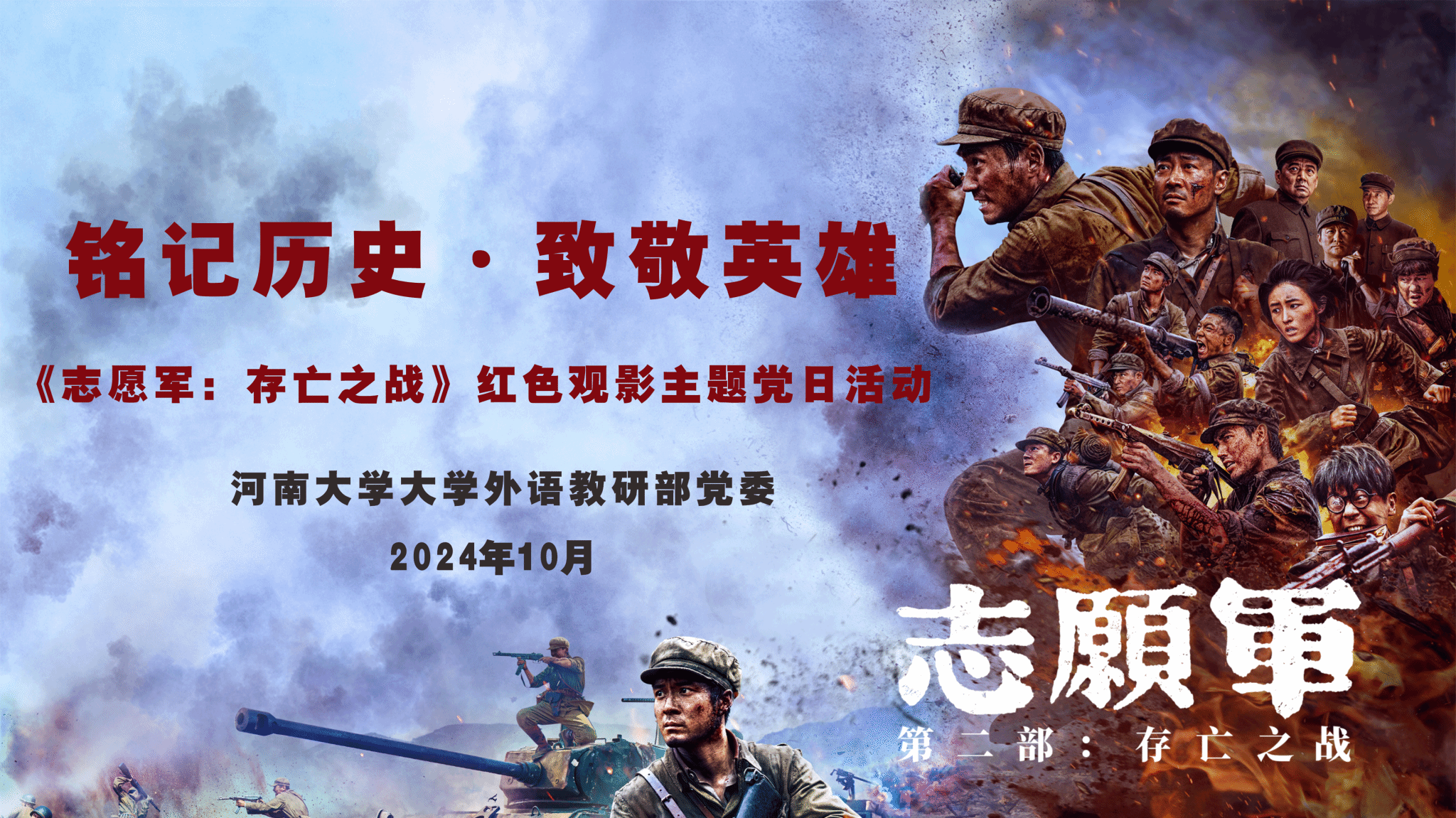 为庆祝中华人民共和国成立七十五周年,10月10日下午,黄小说 党委开展“弘扬爱国主义精神,强化历史责任感与使命感”主题党日活动 —— 观看爱国主义题材电影《志愿军:存亡之战》。教研部全体党员和教职工代表参加了观影活动。
