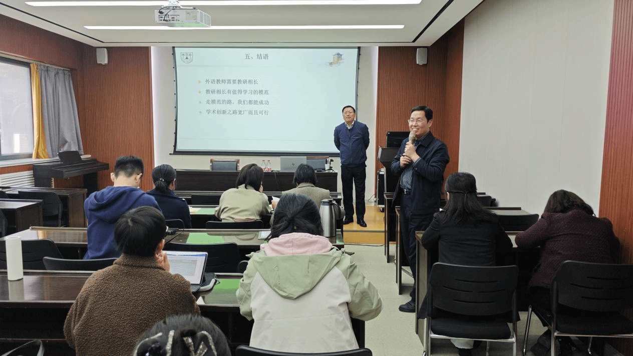 讲座中,陈新仁结合人工智能赋能外语教学的时代背景,深入剖析了学术创新的内涵,系统阐述了外语教学研究在选题、设计、方法及创新等方面的关键问题。同时,他基于南京大学大学外语部的实践经验,分享了新文科建设背景下,大学外语教育教学改革在目标设定、课程设置、师资安排、评估机制等方面的路径与对策,为在场师生提供了宝贵借鉴和针对性指导。互动环节,与会教师踊跃提问,陈新仁逐一给予了细致解答,现场交流热烈,大家纷纷表示受益匪浅。
