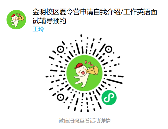 2. 预约完成后,提前24小时将需要辅导的材料发送至邮箱[email protected]。邮件名以“校区+预约时间+姓名”的方式命名,例如“金明2024年5月9日9:00-9:30张三”。3. 完成以上两步后,请携带自己需要辅导的纸质材料按时前往辅导地点,将有专任英语教师为你提供30分钟一对一夏令营申请英语自我介绍/工作英语面试辅导。