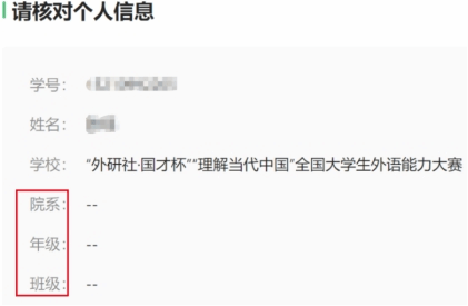 2. 核对个人信息页面中院系、年级、班级三项信息为空,学号栏为报名手机号(非真实学号),不影响正式比赛,确认姓名正确即可。