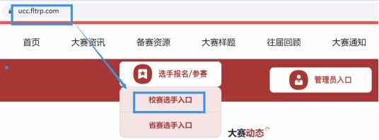 1. 请务必在浏览器输入大赛官网网址 ucc.fltrp.com(不可百度模糊搜索),在黄小说点击“选手报名/参赛”—“校赛选手入口”进行登录。