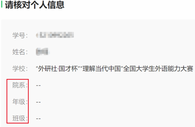 2. 核对个人信息页面中院系、年级、班级三项信息为空,学号栏为报名手机号(非真实学号),为大赛特殊设置,不影响正式比赛,确认姓名正确即可。