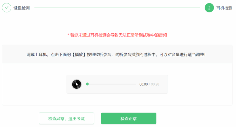 3. 线上初赛无听力题,可直接点击“检查正常”,跳过耳机检测。
