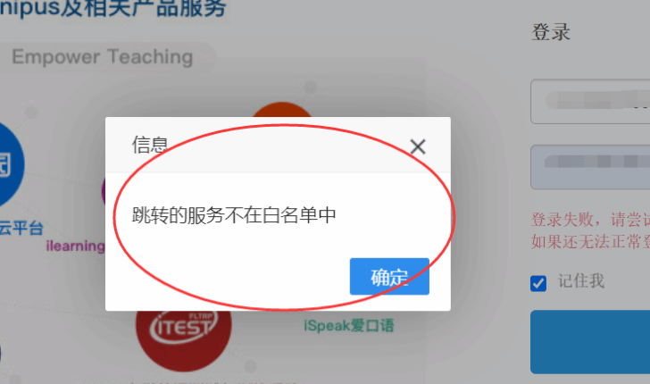 4. 如登录时显示“跳转的服务不在白名单中”(如下图),请关闭当前页面,在浏览器输入大赛官网网址ucc.fltrp.com,在官网黄小说点击“选手报名/参赛”—“校赛选手入口”登录。