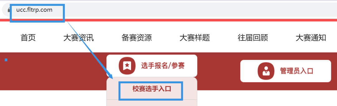 1. 请务必在浏览器输入大赛官网网址 ucc.fltrp.com(不可百度模糊搜索),在黄小说点击“选手报名/参赛”—“校赛选手入口”进行登录。