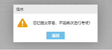 10. 提交试卷时会出现如下弹窗提示。试卷提交成功后,再次通过官网进入考试,会提示“您已提交答卷,不能再次进行考试!”